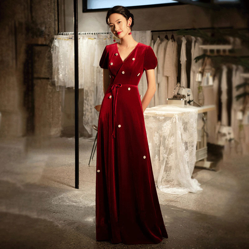 敬酒服新娘2021新款优雅气质设计感晚宴红色礼服女长款丝绒连衣裙热门设计联盟服务商