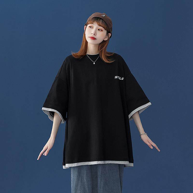 2021年新款夏季假两件短袖t恤女情侣纯棉宽松正肩设计感小众上衣热门设计联盟服务商