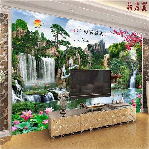 客厅电生背景墙壁纸18D山体壁画影视墙装饰流水视财中式立水墙。热门设计联盟服务商