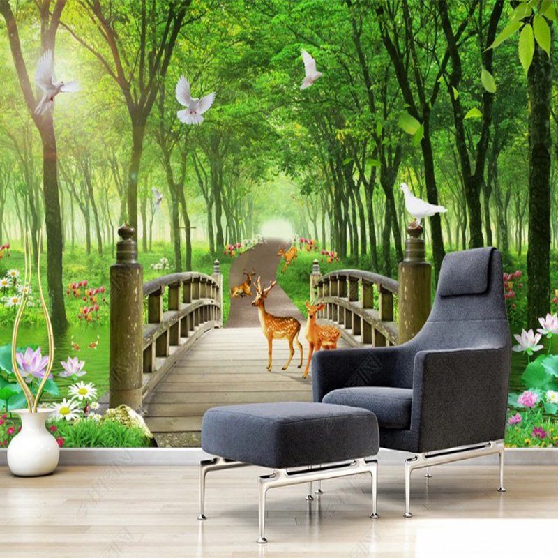 唯美简约绿色森林大树风景花卉工装家装客厅沙发背景环保壁画。热门设计联盟服务商