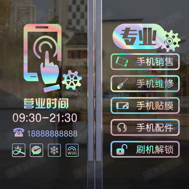 手机维修店广告橱窗布置玻璃贴创意苹果华为手机店海报玻璃门贴纸热门设计联盟服务商