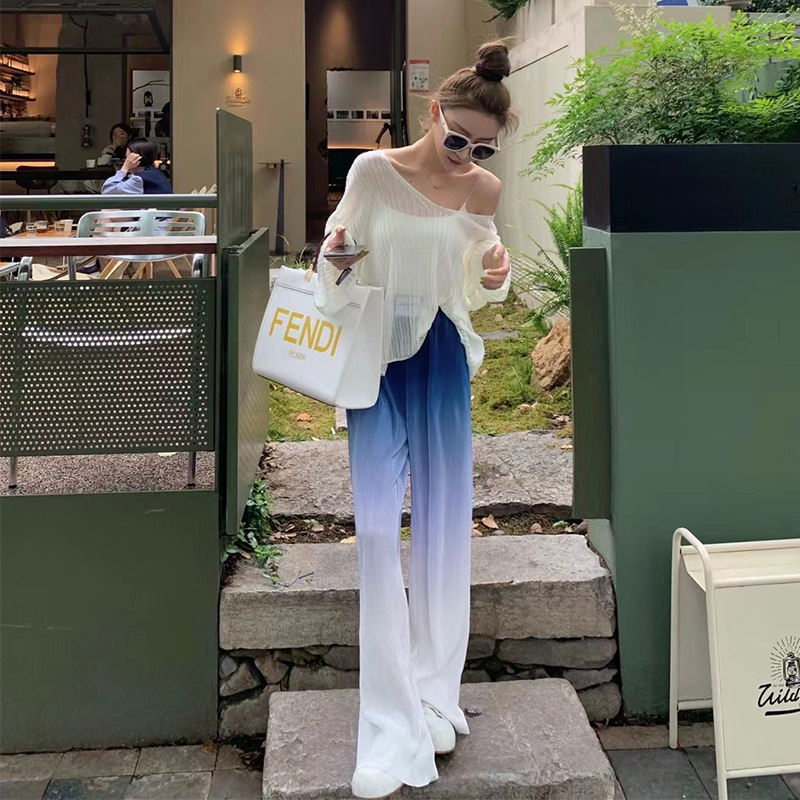 设计感渐变色蓝紫百褶阔腿裤女夏季高腰垂感宽松直筒休闲拖地裤潮热门设计联盟服务商