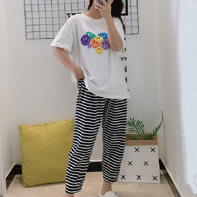 可爱笑脸条纹睡衣女春夏短袖长裤套装卡通胖mm家居服可外穿薄款春热门设计联盟服务商