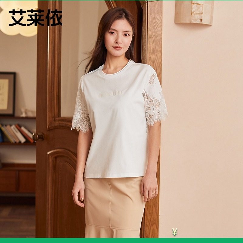 艾莱依蕾丝拼接短袖体恤女2021夏新款设计感小众温柔风修身上衣热门设计联盟服务商